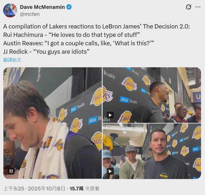 湖人球员里夫斯表示:“我觉得他当时发布那个内容的时候,确实引发了全球关注,我也收到了几个电话,问我‘这是什么?’,显然,人们以为他要退役了,我很高兴他没有。”